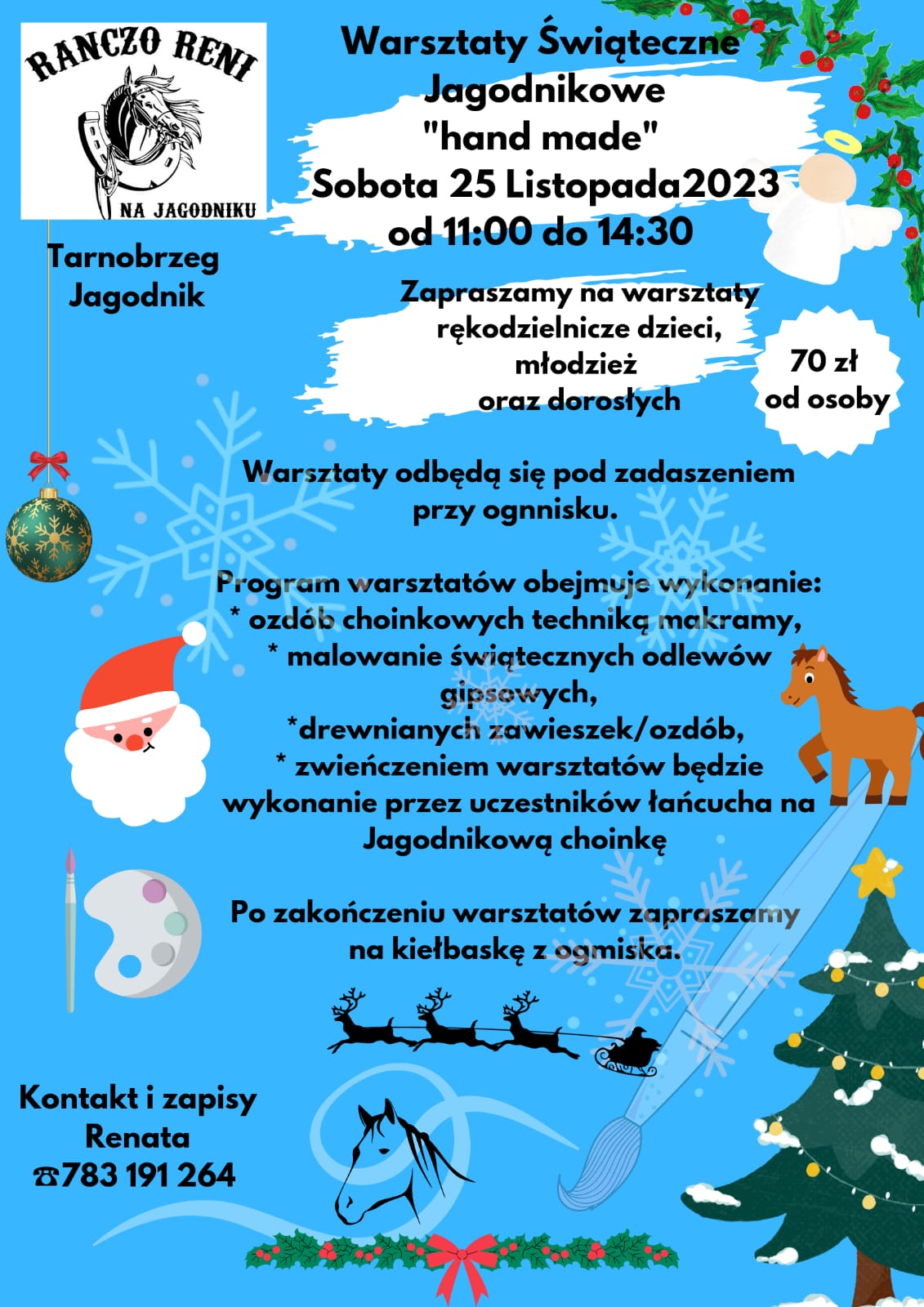 Ranczo Reni na Jagodniku GPW9+45 Tarnobrzeg, PolandZapraszamy serdecznie wszystkich na warsztaty rękodzielnicze "hand made" przy ognisku i w dobrym towarzystwie. Warsztaty odbędą się pod zadaszeniem, a po ich zakończeniu zapraszamy wszsytkich na pyszną kiełbaskę z ogniska. W programie: wykonanie ozdób choinkowych metodą makramy; malowanie świątecznych figurek gipsowych; ozdabianie drewnianych zawieszek / ozdób; zwieńczeniem warsztatów będzie wykonanie wspólnego łańcucha na Jagodnikową Choinkę. […]